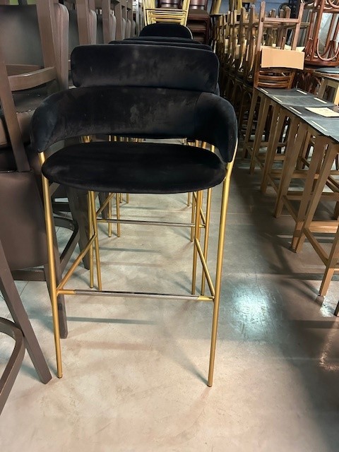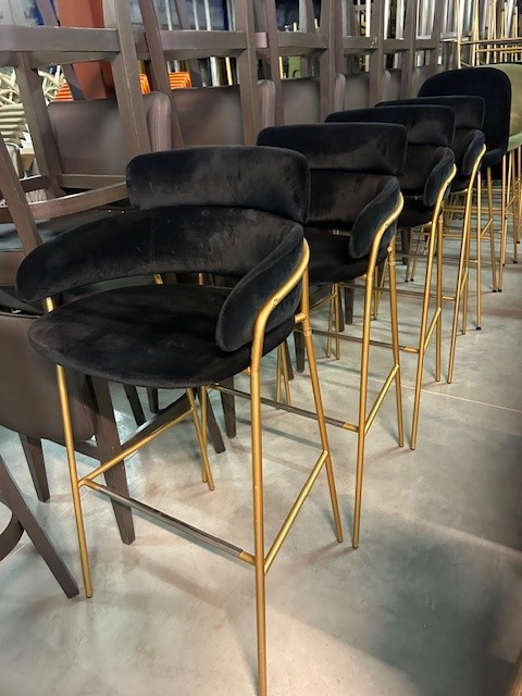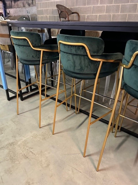 Gestoffeerde barkruk van het merk Arrmet - model Strike.Gestoffeerd met Kobe Tour zwart fluweel / Carlucci groen fluweel. Goudkleurig frame.Tweedehands in goede staat.4 x zwart 6 x groenNIEUWPRIJS € 825,00 incl BTW