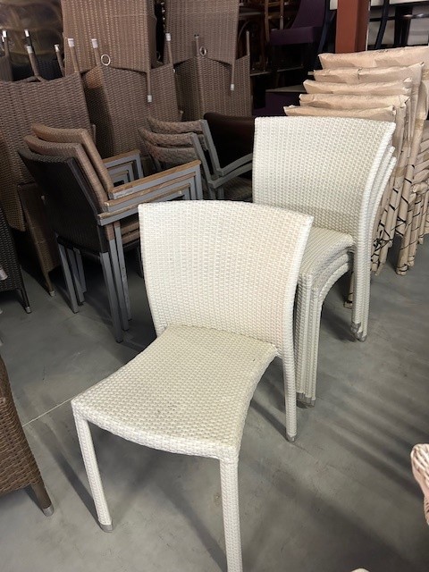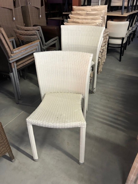 Cannes stack NIEUW zonder armleuningen.Stapelbare terrasstoelen.12 stuks in voorraadEventueel te combineren met Cannes stack white met armleuningen.