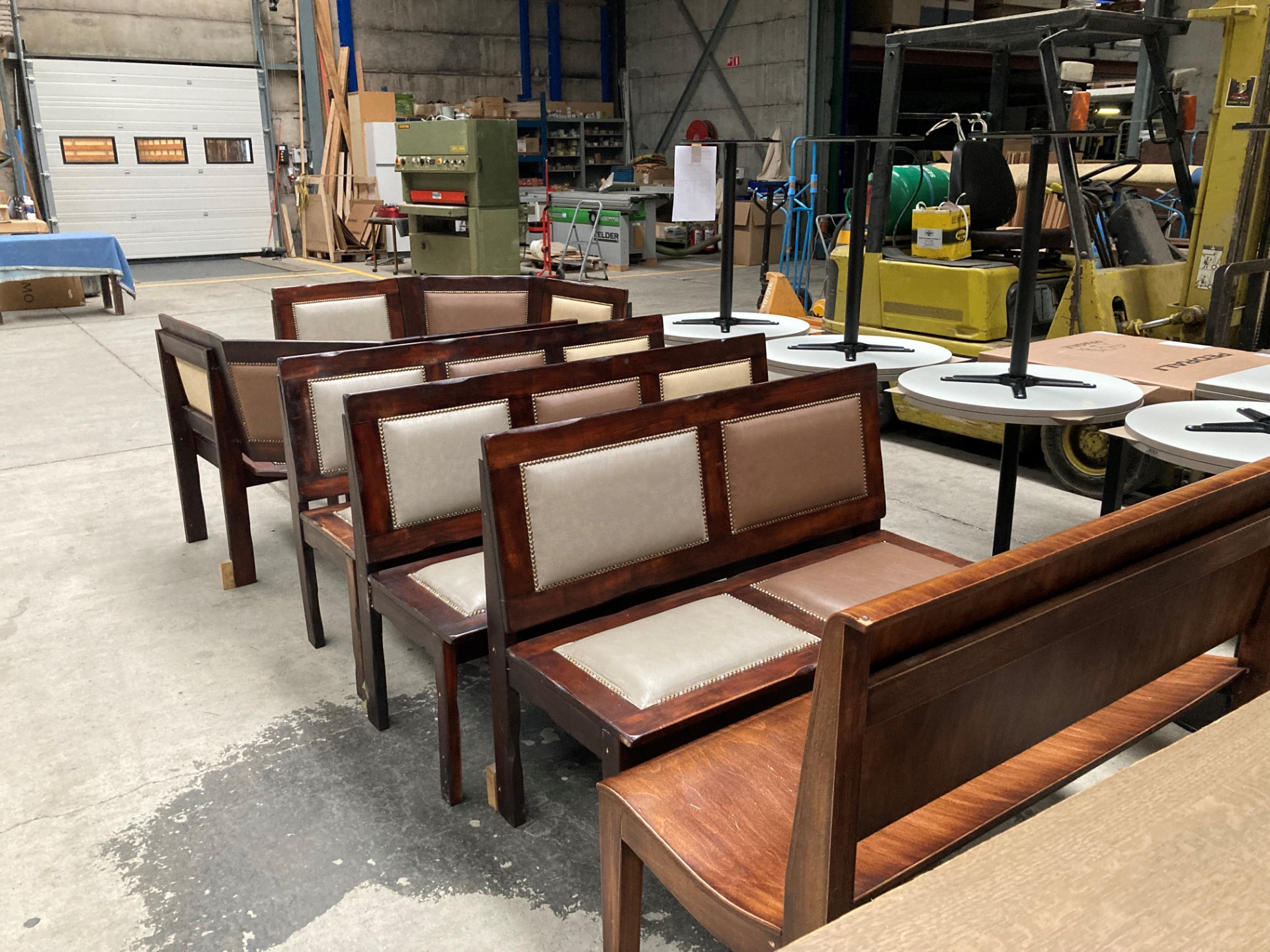 Houten cafebank bekleed met kunstleder op rug en zit afgewerkt met siernagels.Bijhorende hoekbank in voorraad.Lengte: 140 cm 2stuksLengte: 120 cm 1 stuk