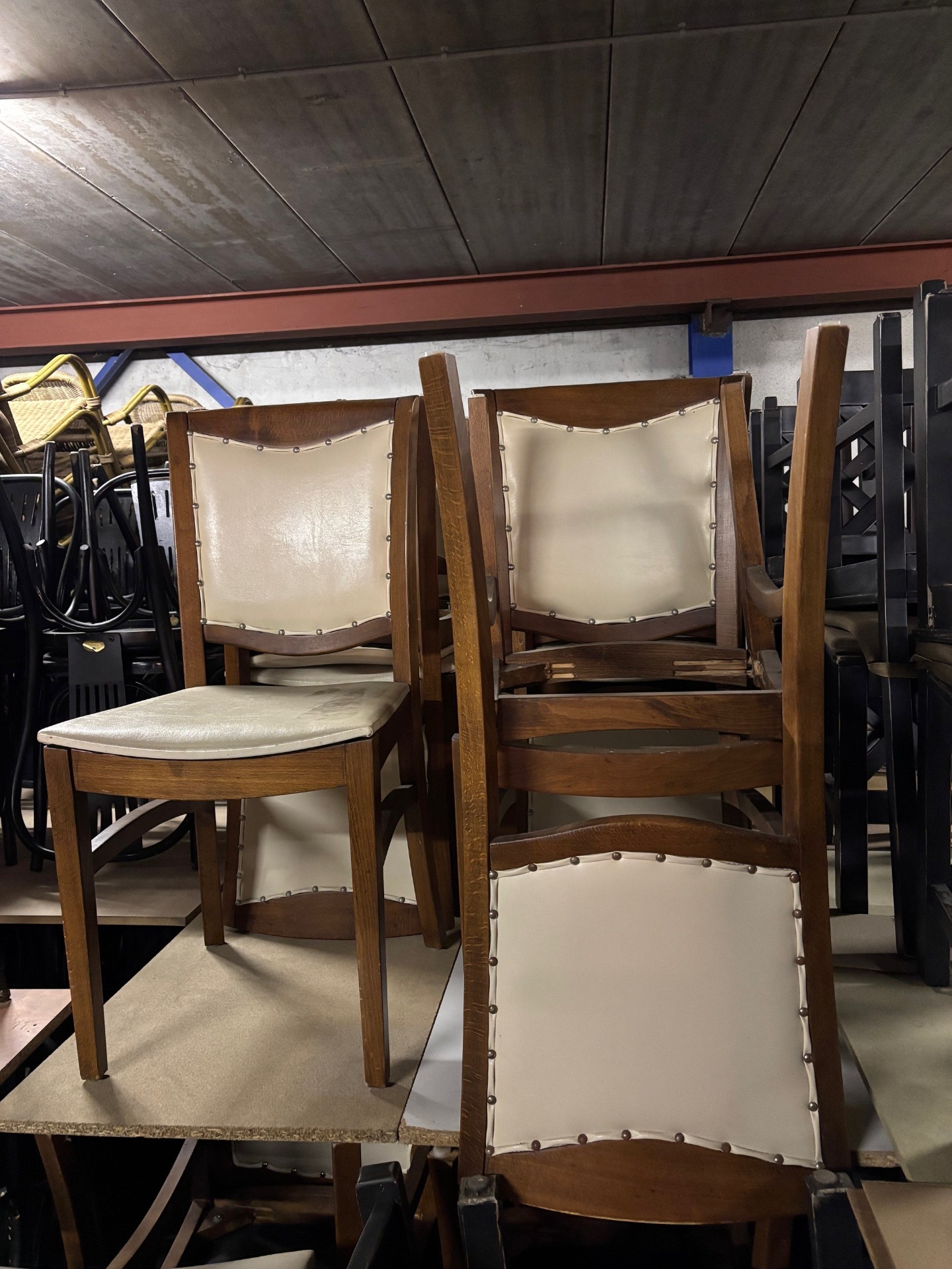 Houten stoel zonder armleuningen. Rug en zit bekleed met kunstleder.