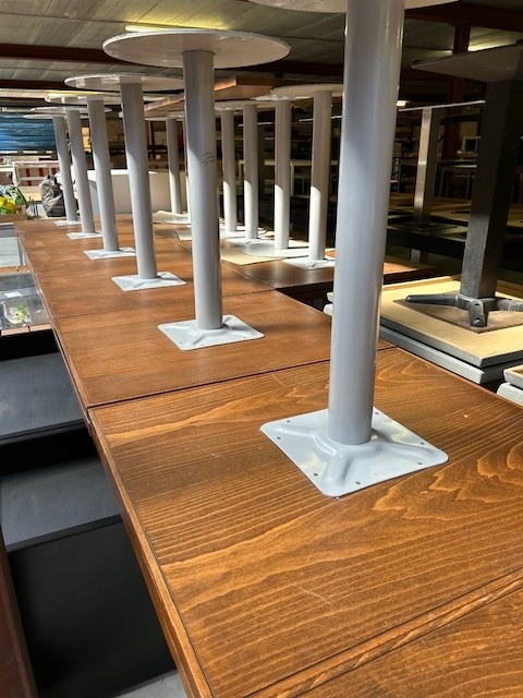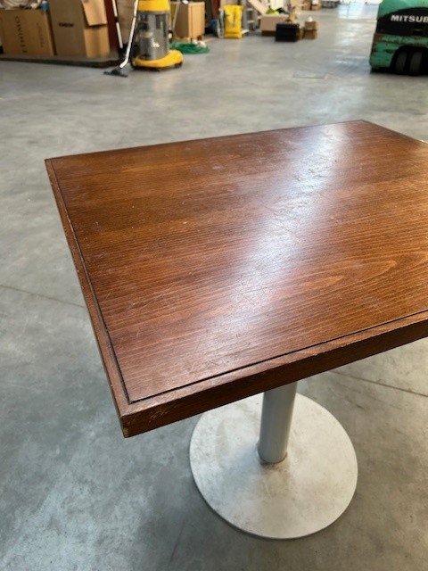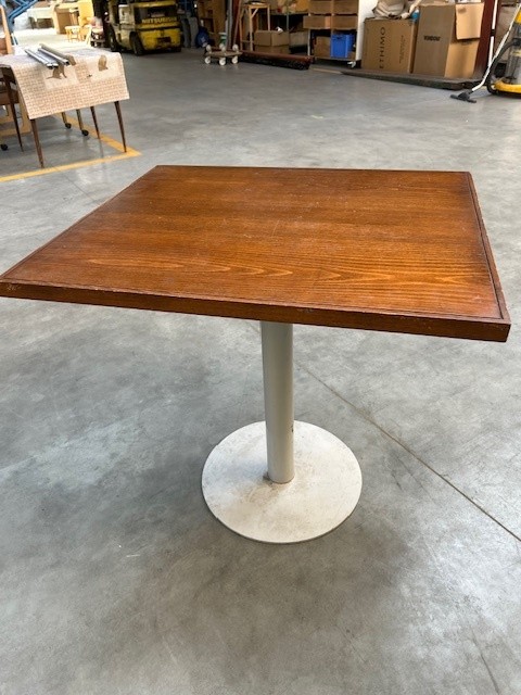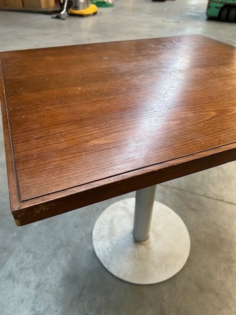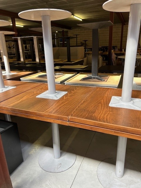 Tweedehands tafels met grijs centraal onderstel en houten blad.25 stuks in voorraad