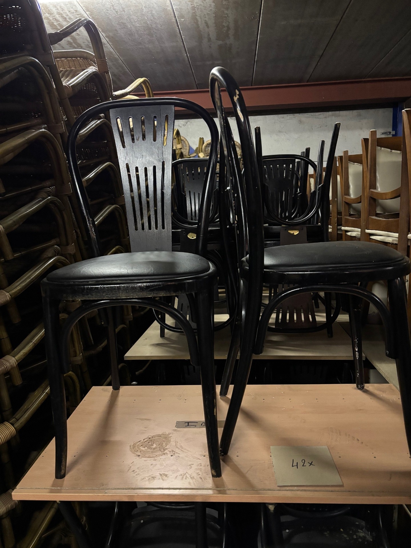 Zwarte restaurantstoel in hout, zit bekleed met zwart kunstleder.